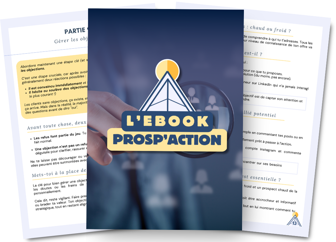 Tu veux des clients mais tu détestes la prospection ? Dans cet ebook tiré de notre célèbre challenge Prosp'Action, tu découvriras les fondements d'une prospection efficace et sans stress. La recherche de clients ne doit pas être une source d'angoisse, et grâce à notre méthode éprouvée, tu t'engageras dans ce processus avec assurance !